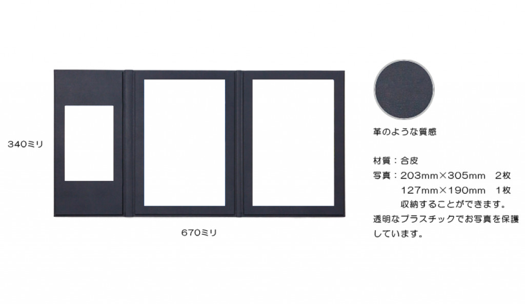 サイズ折りたたみ時 240mm×340mm(厚20mm)展開時 670mm×340mm(厚5mm)縦写真はもちろん、横写真にも対応しています。くつろぎの空間に大切な思い出を添えてはいかがですか。写真は、六切ワイド(203mm×305mm)2枚と2Lワイド(127mm×190mm)1枚が収納できます。
