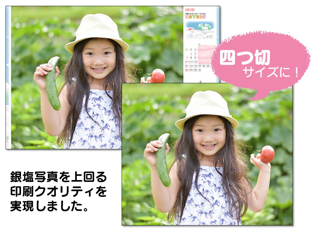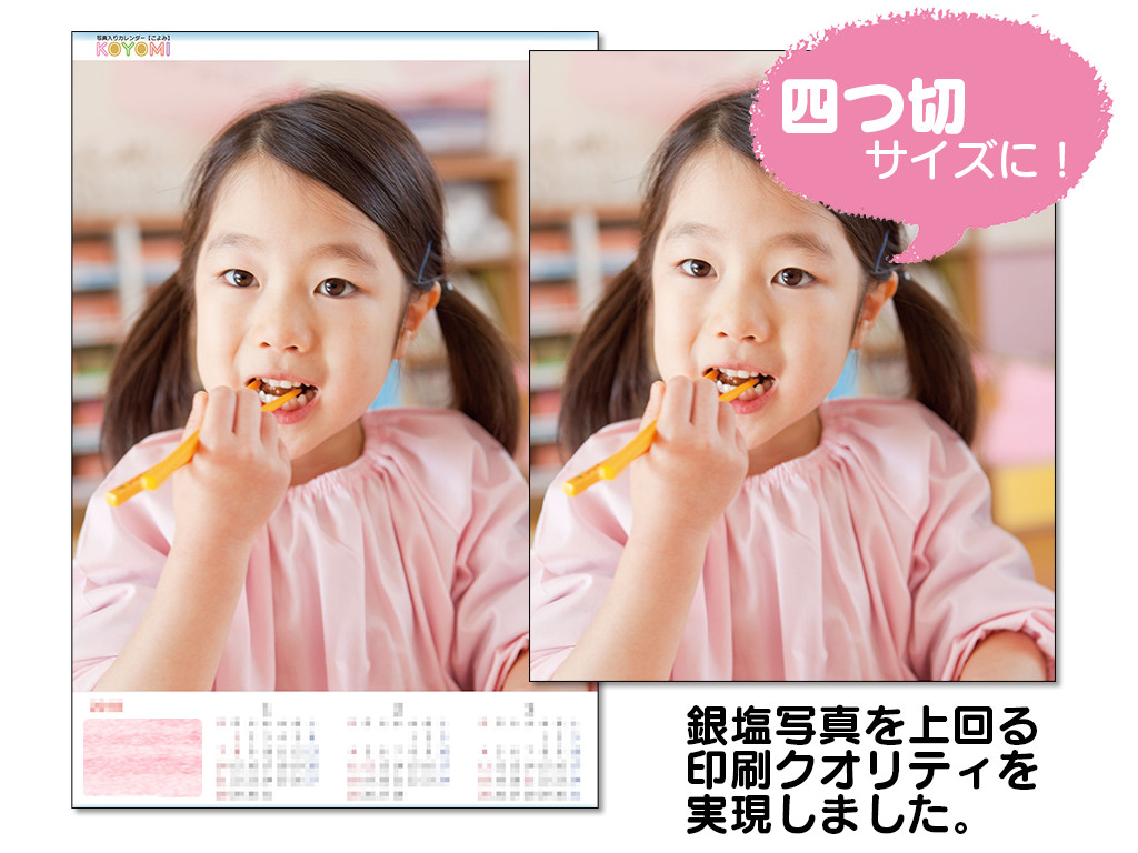 銀塩写真を上回る、印刷クオリティを実現しました。大切な思い出をいつまでもキレイに残します。高画質のプリント写真カレンダーです。カレンダー部分を切り離すと四切プリント(254mm×305mm)と同じサイズに!お好きな月から始められる3ヶ月カレンダーです。